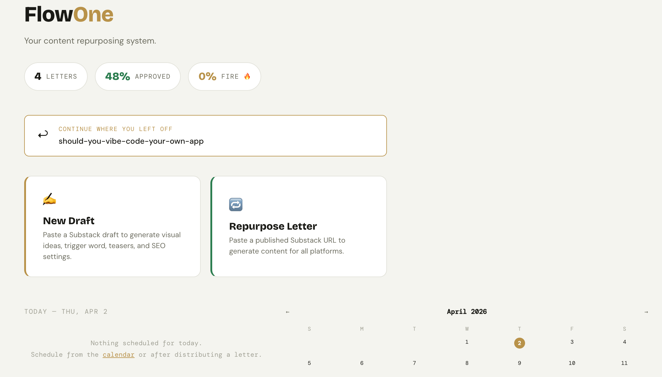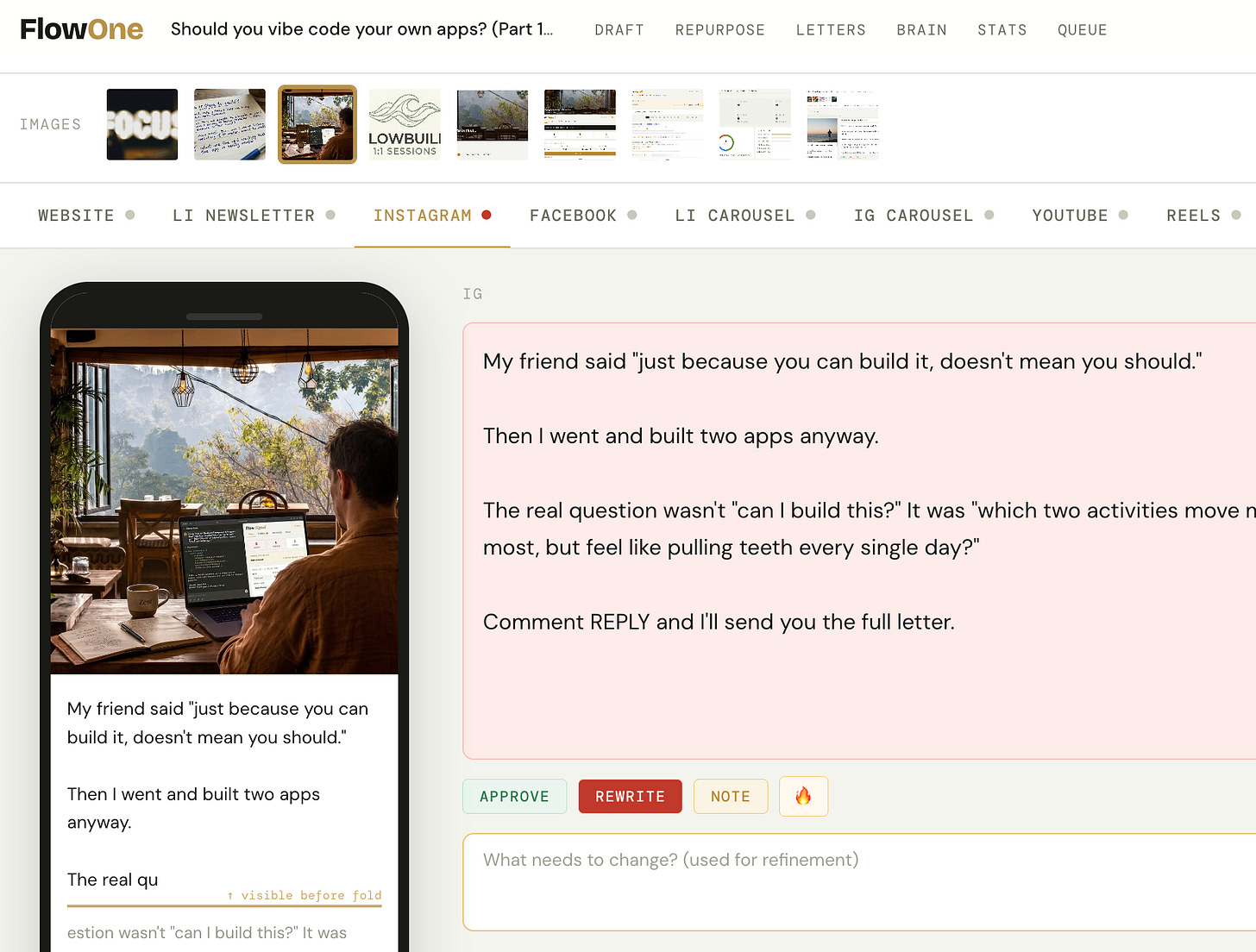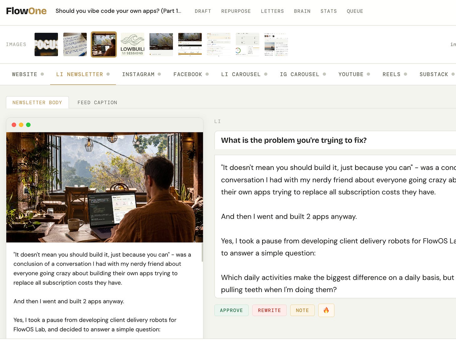 Once a letter is published, I paste the link and FlowOne pulls the content and runs it through the full distribution system. I can preview how each piece looks on the actual platform - where the text breaks and what needs tightening before it goes into my posting calendar.
