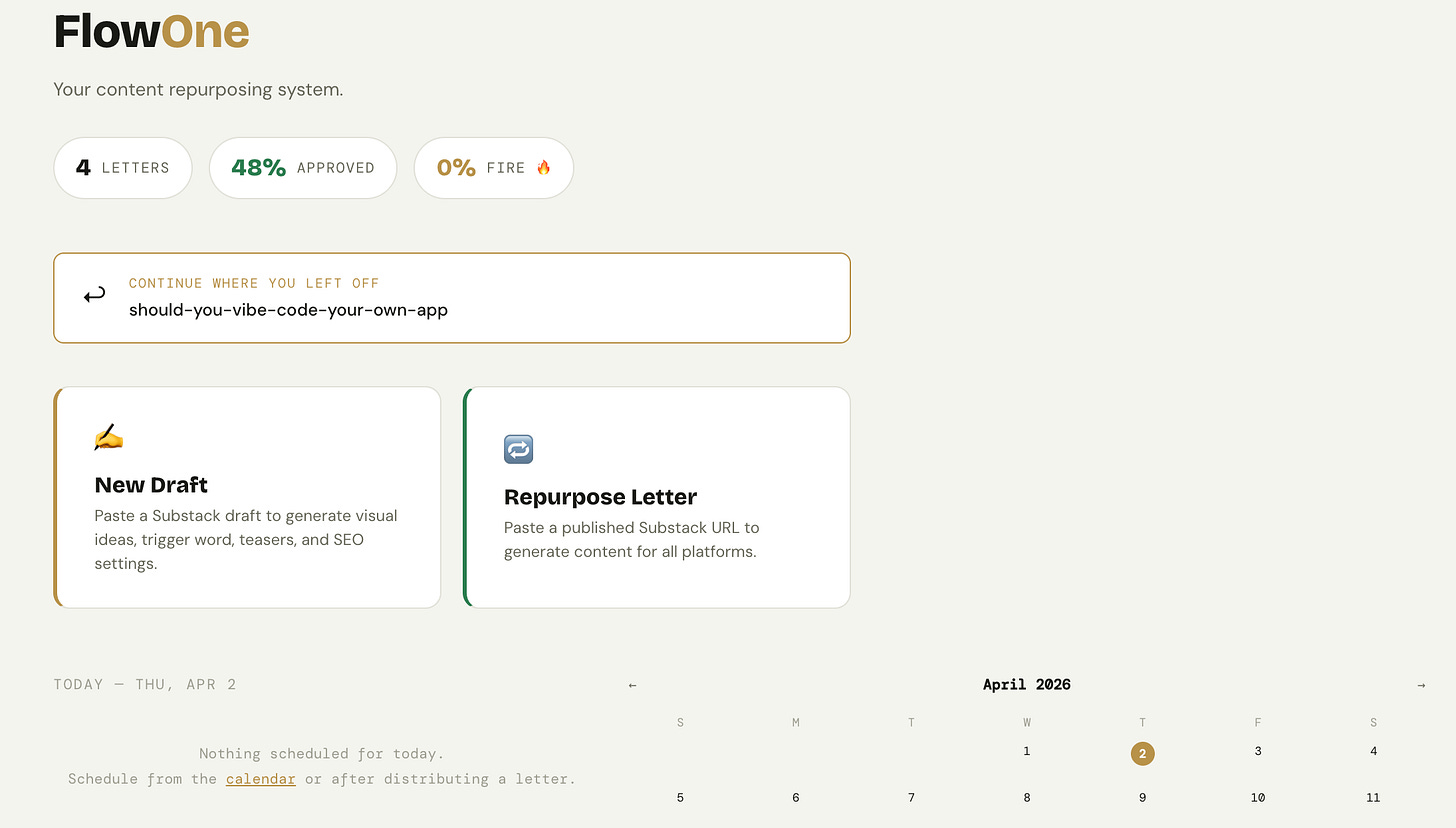 I was spending hours writing my Substack letters and barely repurposing any of it. So I built an app that turns each letter into 40 content pieces in under a minute - for $0.30 a run. Here's exactly..