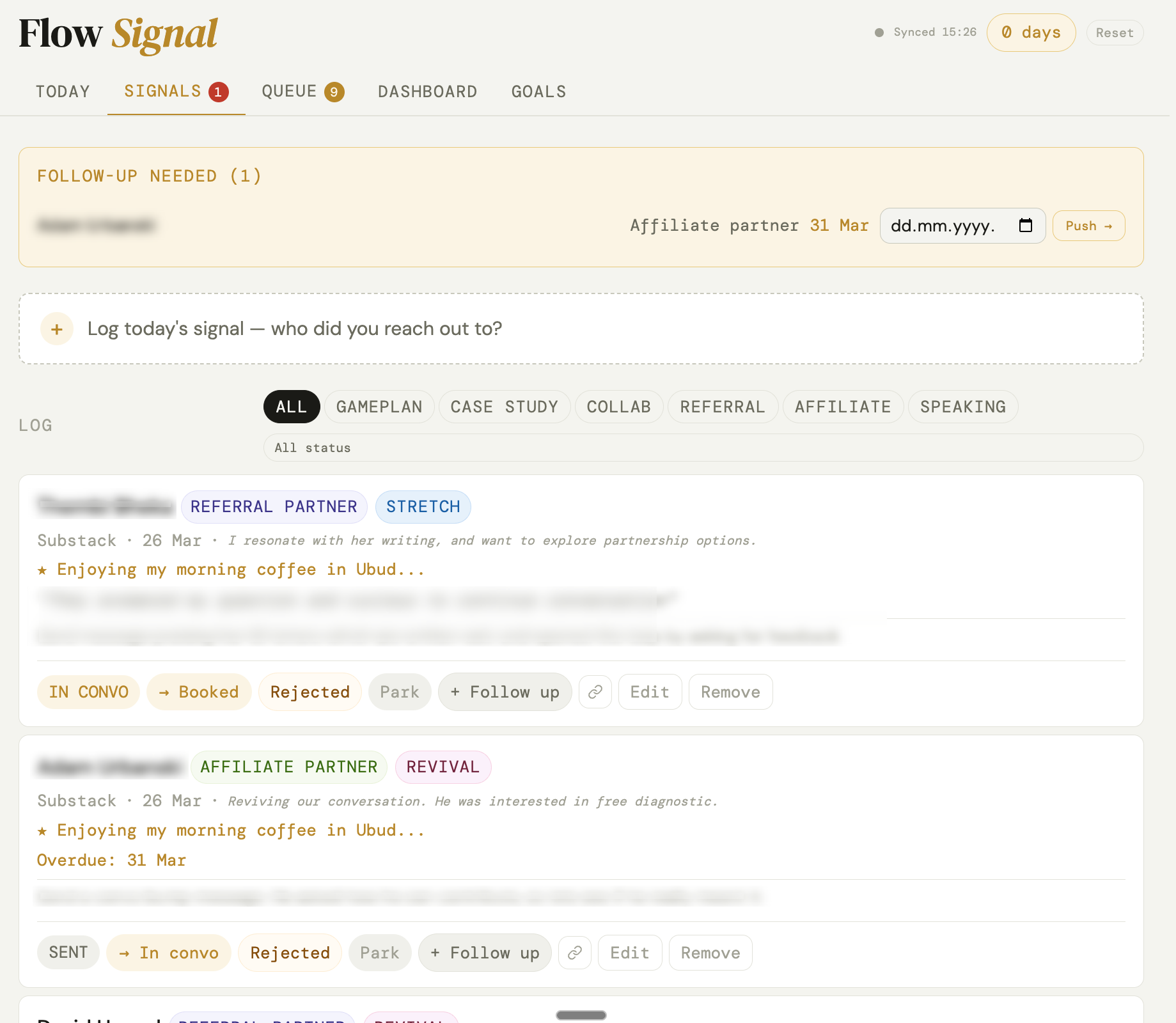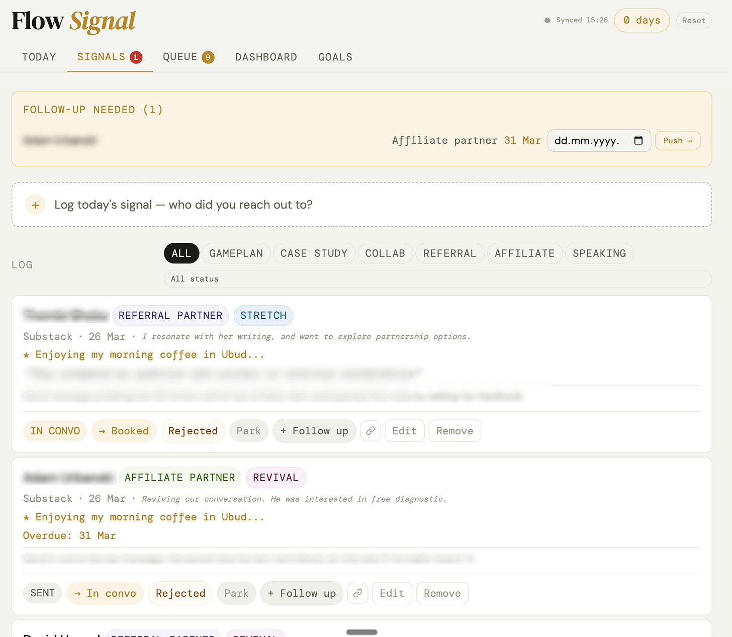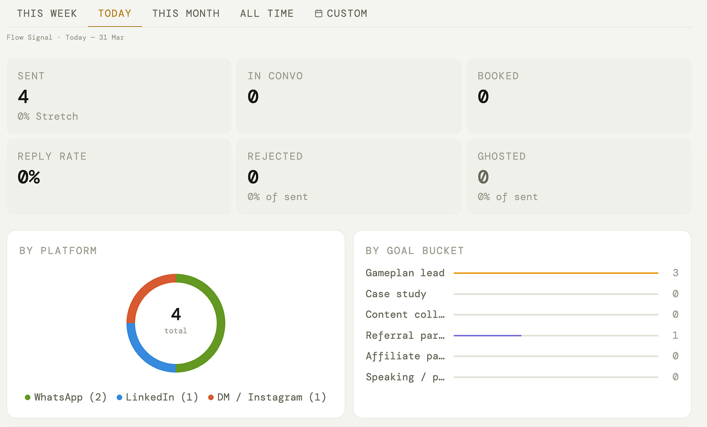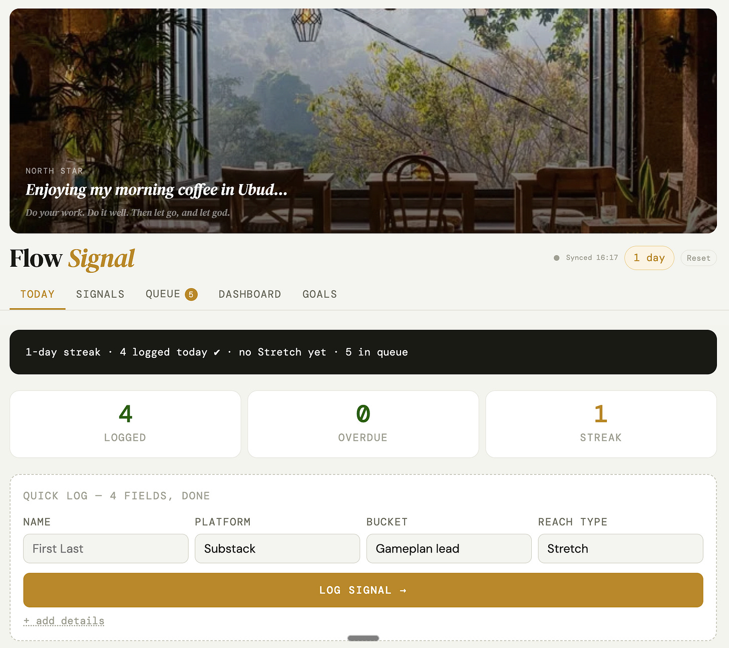 The outreach tool seemed simpler, so I focused on it first and called it FlowSignal - since I’ll be logging different signals daily.